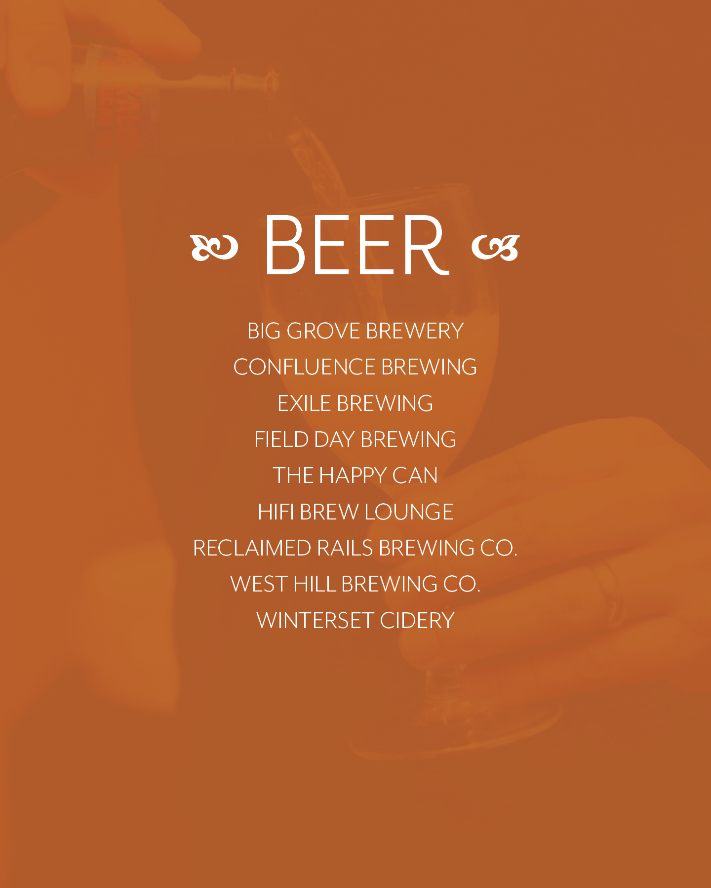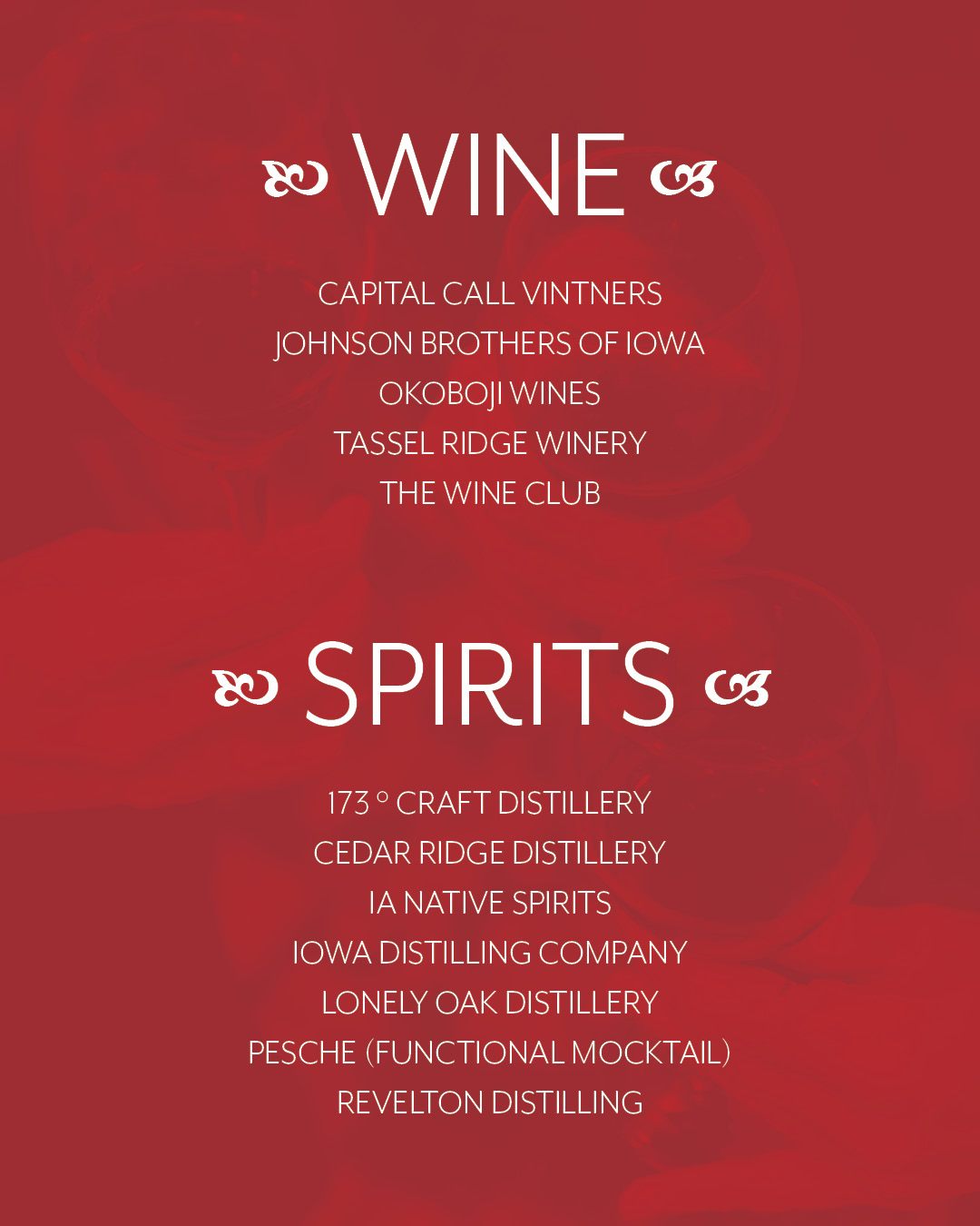 173 Craft Distillery, Big Grove Brewery, Capital Call Vintners, Cedar Ridge Distillery, Confluence Brewing Company, Exile Brewing Co., Field Day Brewing Co., The Happy Can, HiFi Brew Lounge, IA-Native Spirits, Iowa Distilling Company, Johnson Brothers of Iowa, Lonely Oak Distillery, Okoboji Wines, Pesche, Reclaimed Rails Brewing Company, Revelton Distillery, Tassel Ridge Winery, West Hill Brewing Company, Winterset Cidery, The Wine Club
